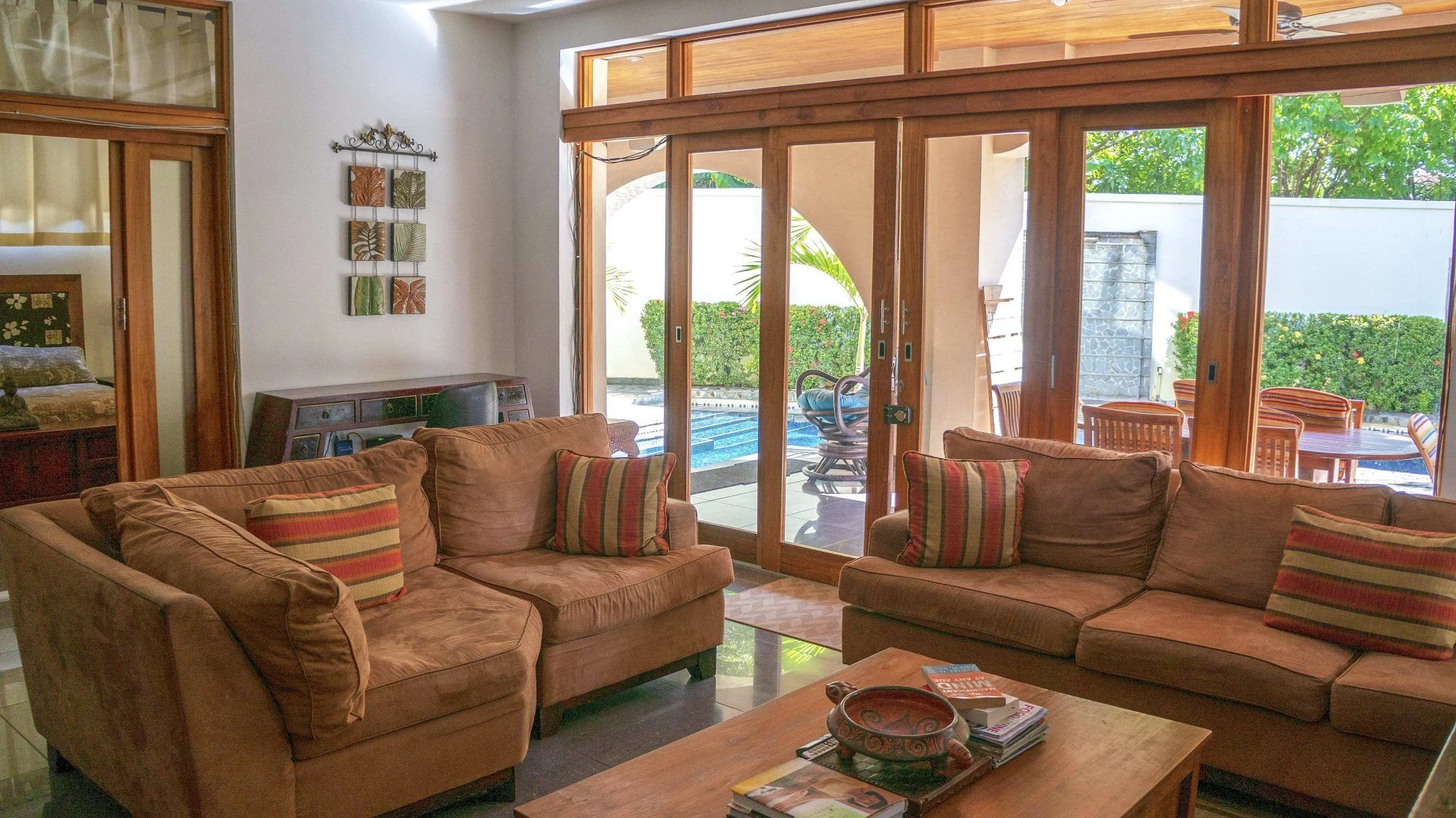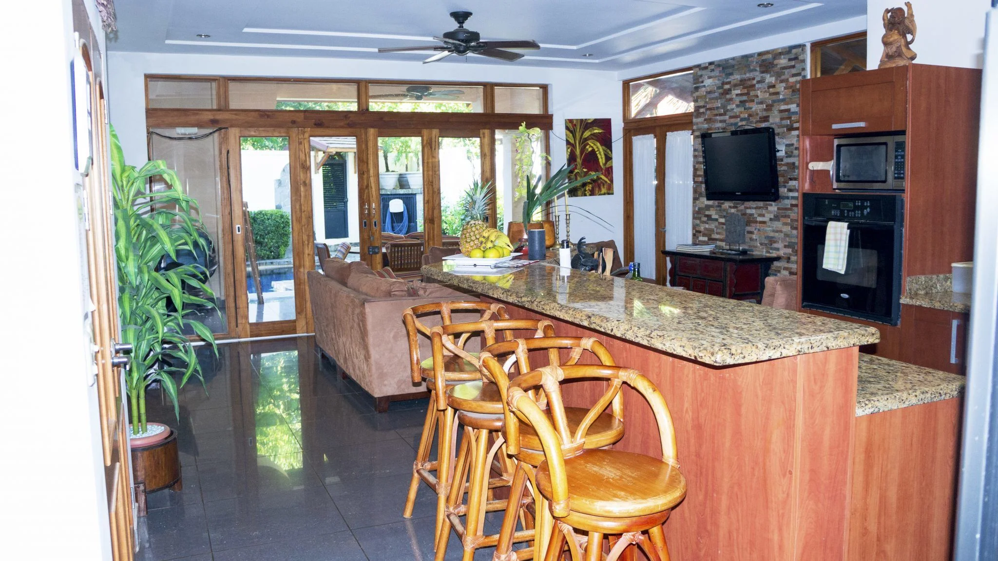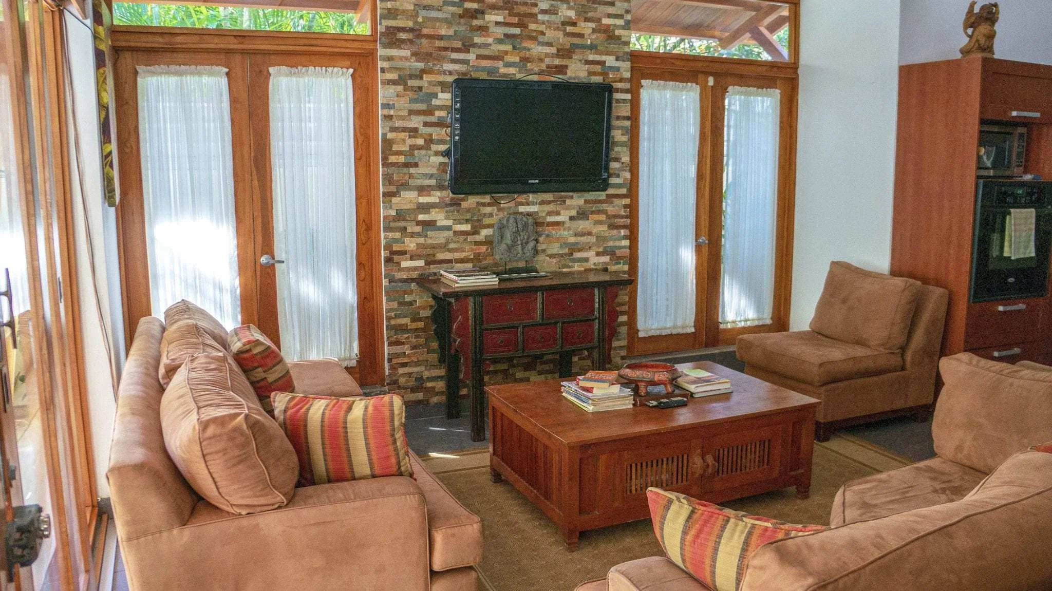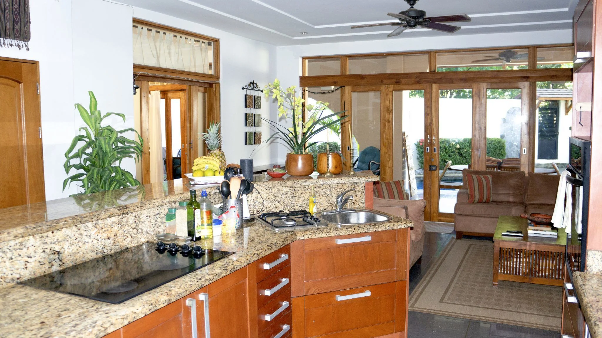 The open concept living room offers lush microfiber sofas with enough seating for 6. Read a good book, or watch TV on our 40″ LCD TV, all while catching up with friends. The living room opens out to the fully furnished veranda.