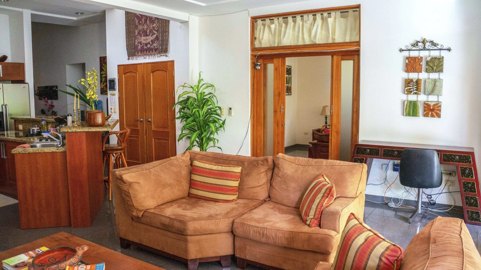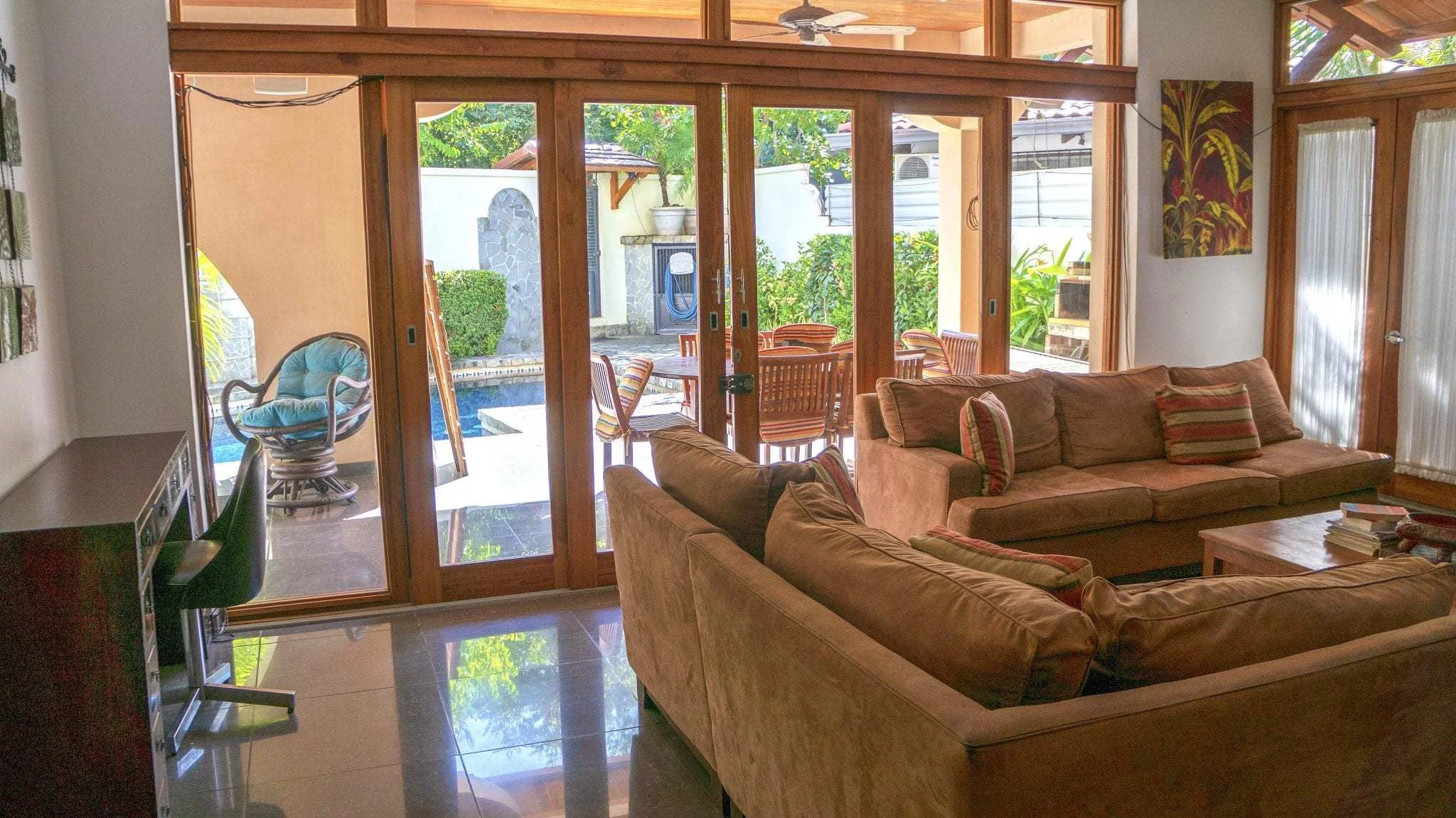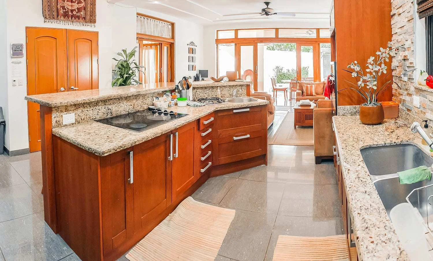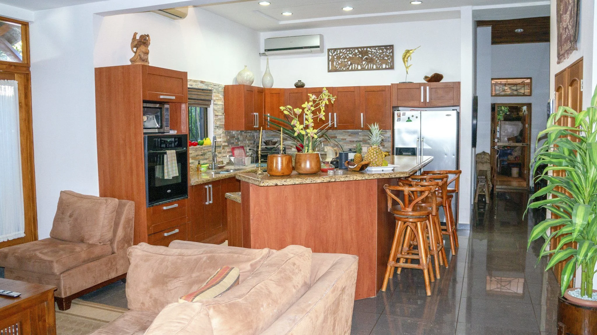 The open concept living room offers lush microfiber sofas with enough seating for 6. Read a good book, or watch TV on our 40″ LCD TV, all while catching up with friends. The living room opens out to the fully furnished veranda.